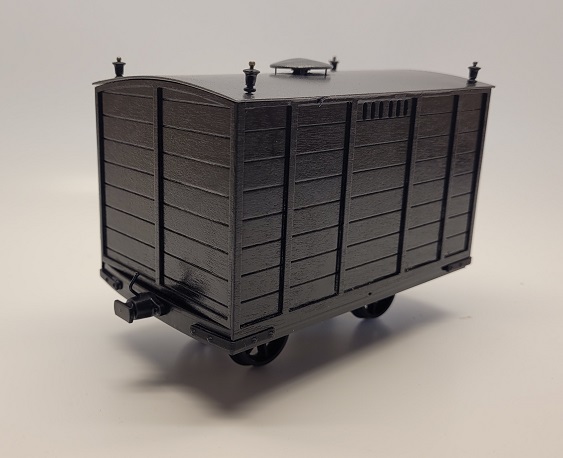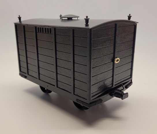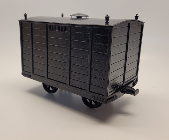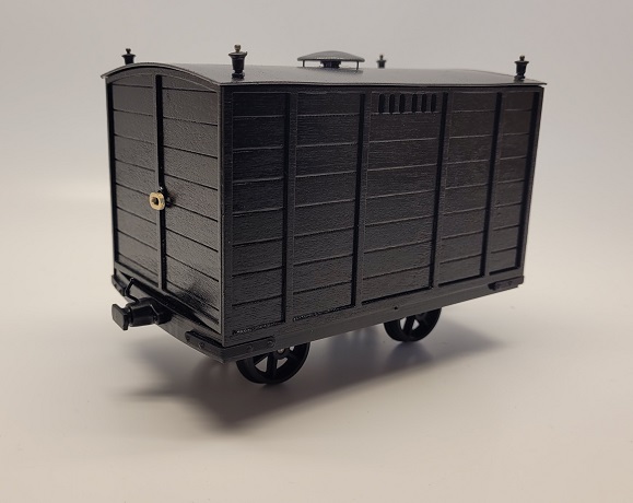Additional detailing is achieved by resin printed detailing parts. The running gear is standard Binnie wheels, with steel axles and a set of our custom CNC machined brass bearings. There is also the option to upgrade to our CNC machined steel wheels. Each part of the kit has been produced by a process that is optimised for that part. The dimensions below are all maximum dimensions, so over couplings for the length and over any detailing parts on the outside for the width. The height is from the top of the rail, to the highest part of the vehicle. Length – 154mm The kit contains everything you need to build the van, including our detailed and illustrated instructions. The only thing the kit does not contain is any paints and adhesives. As with all of our kits, this has been designed to be a straight forward kit to build, perfect for beginners. It can be built and assembled as supplied to be a great representation of the FR hearse van, or it can be “super-detailed” to add even more realism to your model, although, having said that, there is no more detail to add! Additional information about this van can be found on the Festipedia site here. Images of the van can be found on the Ffestiniog Railway Heritage Group’s Ibase website. The demonstration model is painted in Tetrion Gloss Black, with a coat of Rustoleum Gloss Clear Coat. The roof is painted with Rustoleum Gunmetal spray paint.